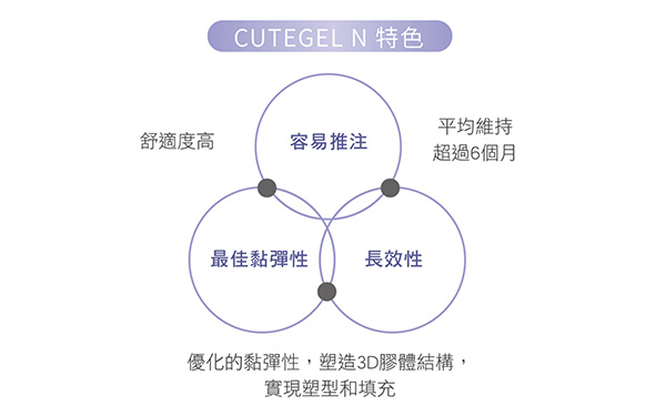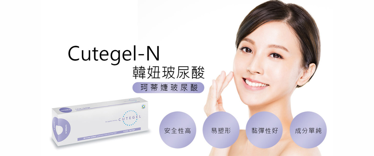 Cutegel N珂蒂婕玻尿酸 是一種以非動物性玻尿酸(HA)為主要成分的填充劑,因為他是非動物性玻尿酸,並沒有參雜其他生物的抗原,因此人體對他產生過敏反應的機率極低(低致敏性)再執行施做療程。